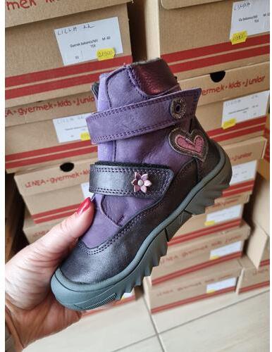 LINEA valódi bőr, bundás béléses téli bakancs lányoknak lila színben, szívecskés mintával,   Cipő jellemzői: