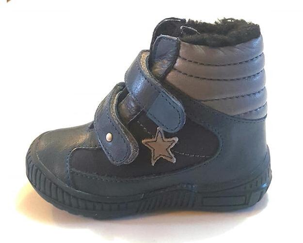 LINEA valódi bőr, bundás béléses téli bakancs fiúknak kék színben, csillagos mintával,    Cipő jellemzői: